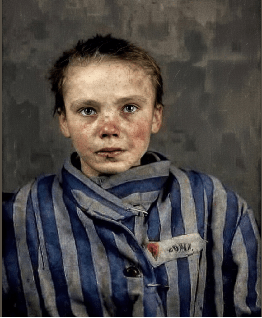 “The original black-and-white picture was taken in December 1942 by Wilhelm Brasse, a fellow prisoner forced to work as a photographer in the camp. Brasse remembered Czesława vividly, noting that she was terrified and had been brutally beaten by a female guard (Kapo) just moments before the photo was taken because she did not understand German. The cut on her lip and the bruise are visible in the photograph.”